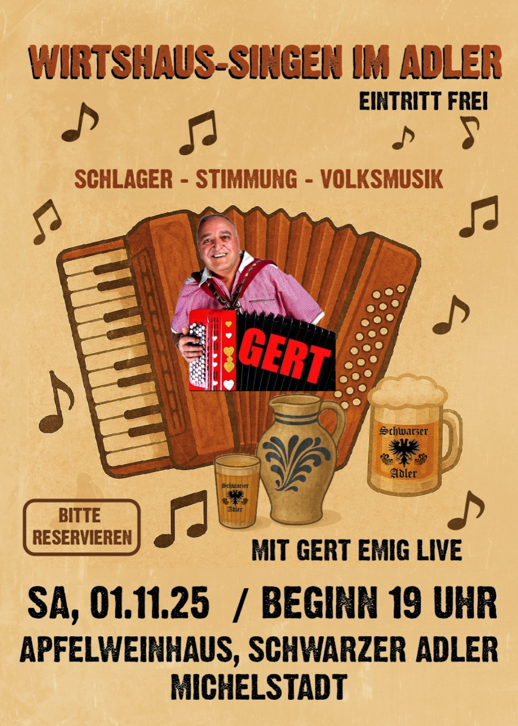 Auftritt im Gasthaus Schwarzer Adler Apfelweinhaus in Michelstadt/Odw AM 01.11.2025