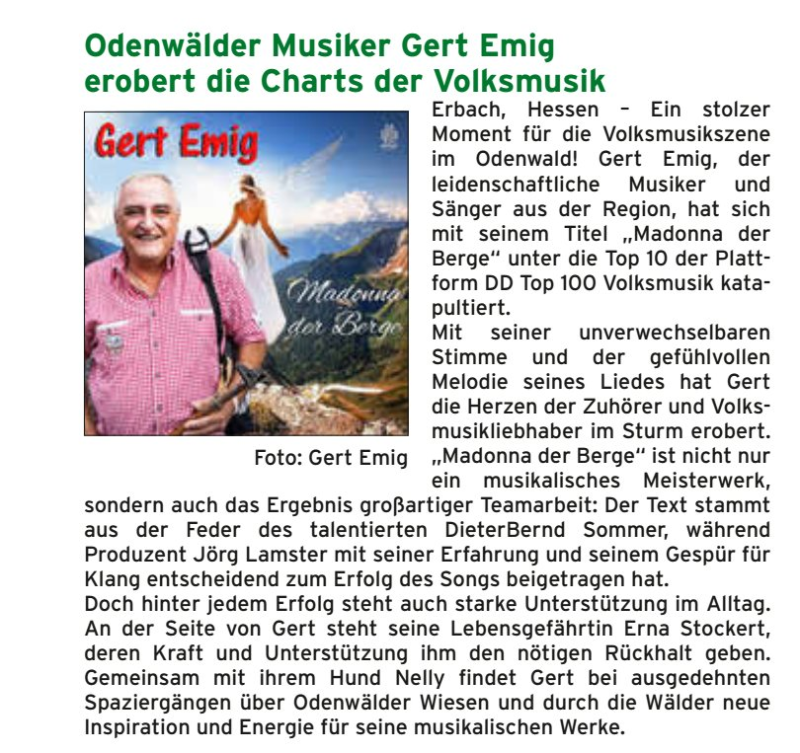 Dorf-Erbach. Der „Zauberhafte Adventsnachmittag“ in Dorf-Erbach war ein voller Erfolg. Die Veranstaltung, in deren Rahmen auch die neue Single von Gert Emig mit dem Titel „Madonna der Berge“ vorgestellt wurde, zog zahlreiche Besucher in das festlich geschmückte Dorfgemeinschaftshaus.
